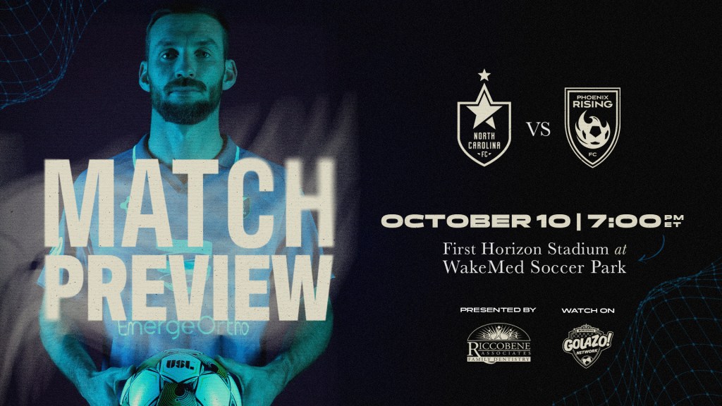 CARY, N.C. (October 9, 2025) — North Carolina FC hosts Phoenix Rising FC on Friday, October 10, at 7 p.m. ET, at First Horizon Stadium at WakeMed Soccer Park for Pups at the Pitch night, presented by Riccobene Associates Family Dentistry. Tickets for the match are available here. The match will stream on Golazo Network.